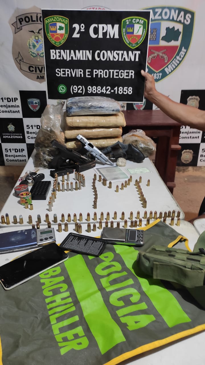 A Polícia Militar do Amazonas (PMAM), por meio da 2ª Companhia Independente de Polícia Militar (CIPM), apreendeu três armas de fogo, cerca de 100 munições e 7,2 quilos de entorpecentes, na noite de sexta-feira (16/02), em Benjamin Constant (a 1.121 quilômetros de Manaus).
