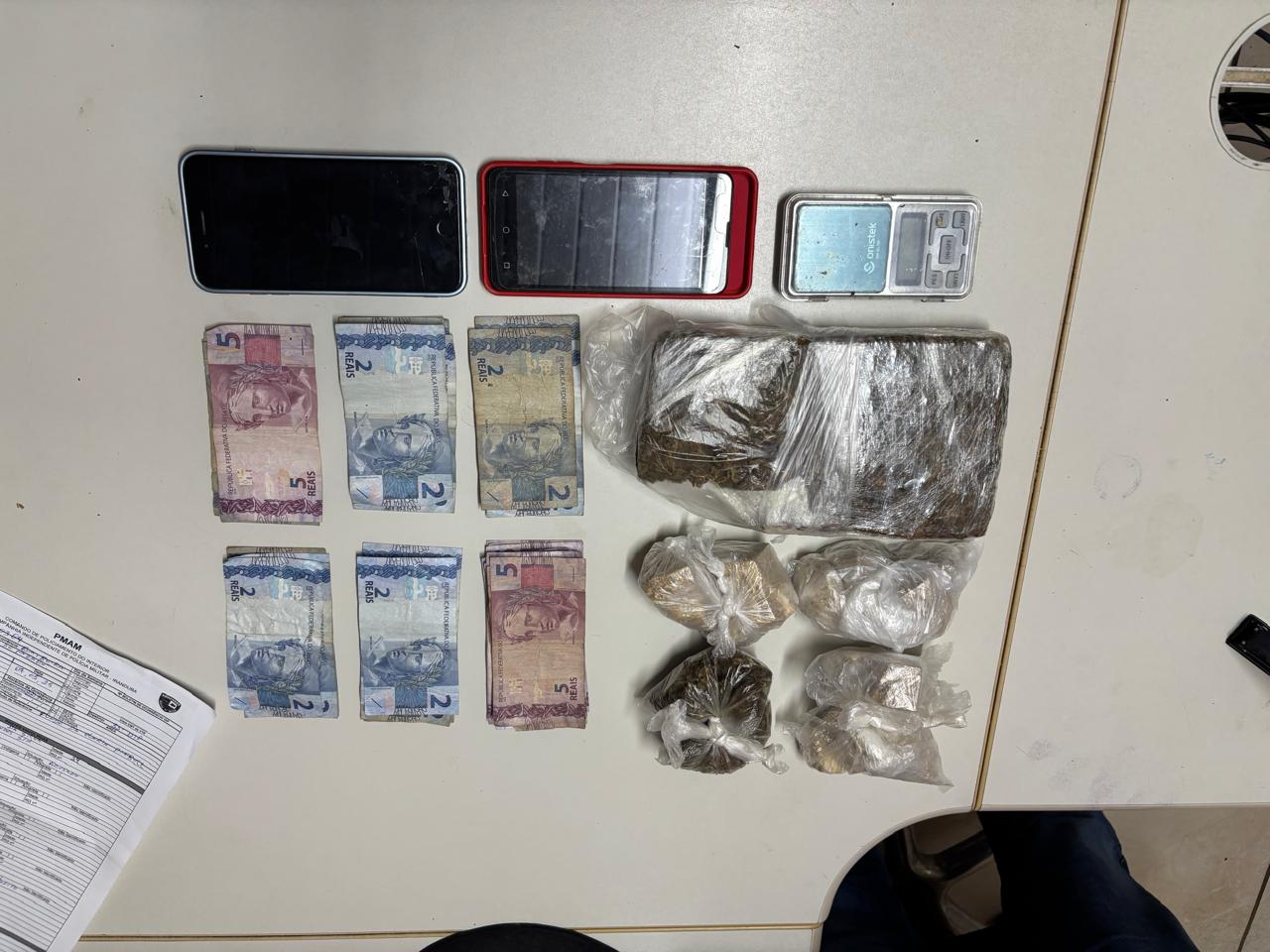 Durante diligências no local, os policiais militares capturaram um dos suspeitos, que estava em posse de uma bolsa. Ao realizarem a revista no interior do objeto, os PMs encontraram um tablete de maconha do tipo skank, 11 porções de entorpecentes, entre maconha, oxi e cocaína, além de dois aparelhos celulares e R$ 103 em espécie.