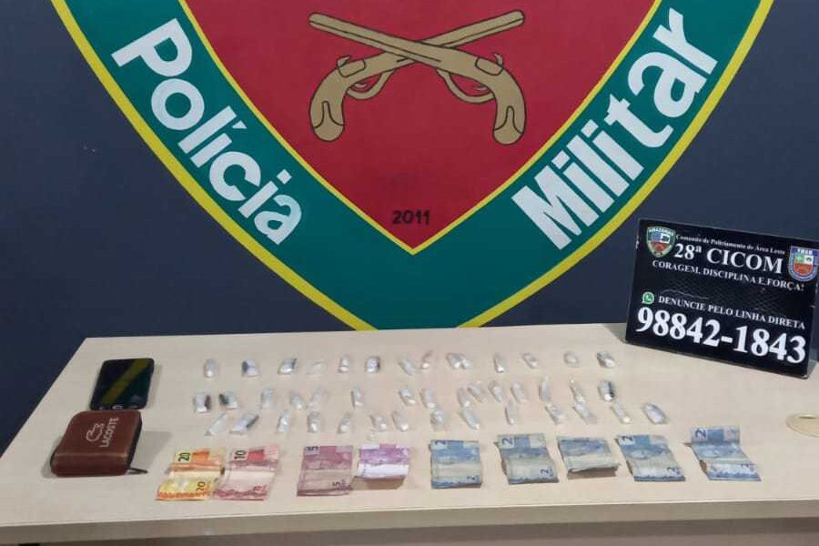Com ele foram apreendidas 43 trouxinhas de cocaína, R$50 em espécie, além de um aparelho celular e uma carteira. O homem e o material apreendido foram encaminhados para o 14º Distrito Integrado de Polícia (DIP).