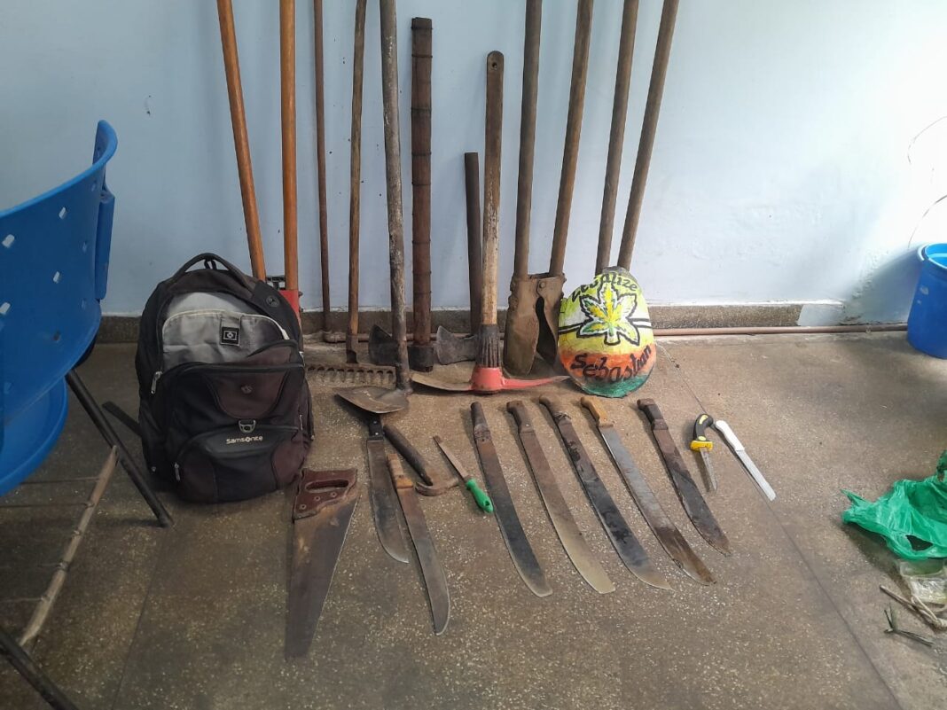 No local, a equipe policial flagrou os suspeitos desmatando e ateando fogo em área de vegetação e realizou a abordagem. Durante as diligências, foram apreendidos sete facões, um serrote, uma enxada, três bocas de lobo, dois machados, uma picareta e dois aparelhos celulares.