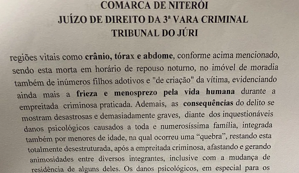 “Os diversos disparos efetuados contra a vítima de apenas 42 anos de idade concentram-se em regiões vitais como crânio, tórax e abdome, conforme acima mencionado, sendo esta morta em horário de repouso noturno, no imóvel de moradia também de inúmeros filhos adotivos e de “criação” da vítima, evidenciando ainda mais a frieza e menosprezo pela vida humana durante a empreitada criminosa praticada”, diz trecho da sentença.