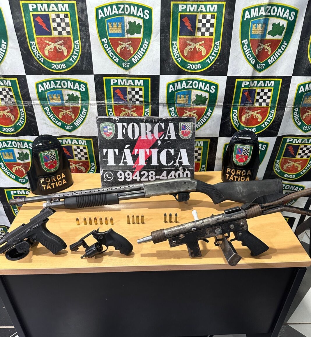 A Polícia Militar do Amazonas, por meio da Força Tática, realizou nas últimas 24 horas, três ações distintas que resultaram em prisões e apreensões de um menor de idade, sete armas de fogo e entorpecentes. Duas ocorrências foram registradas no município de Rio Preto da Eva (a 57 quilômetros da capital), durante o cumprimento da operação Protetor das Fronteiras, coordenada pela Secretaria de Estado de Segurança Pública (SSP-AM).