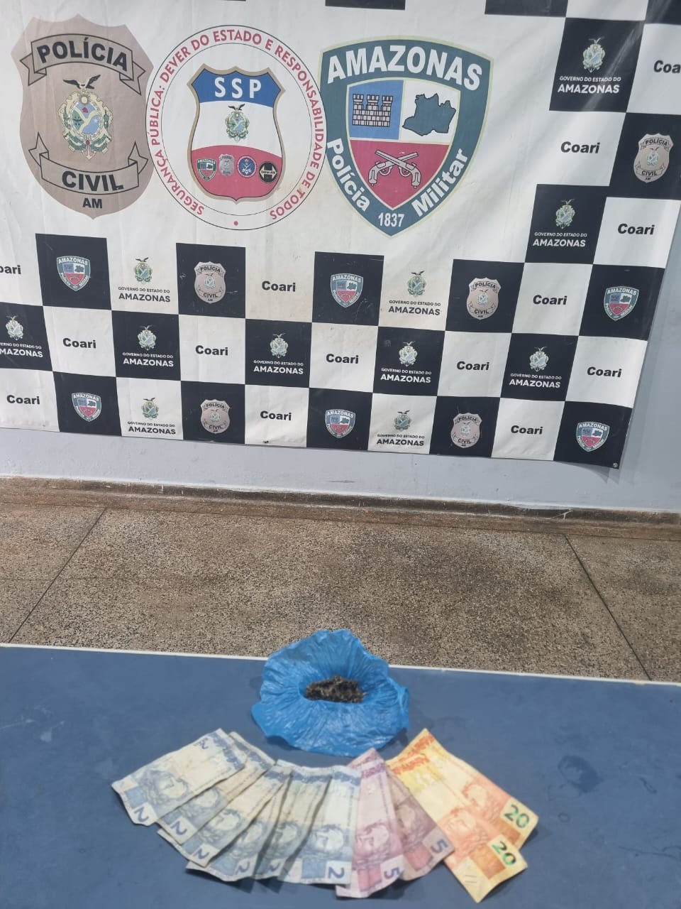 Durante a revista pessoal, a guarnição apreendeu uma porção de maconha e R$ 62 em espécie. O infrator foi direcionado à delegacia do município, juntamente com o material ilícito apreendido.