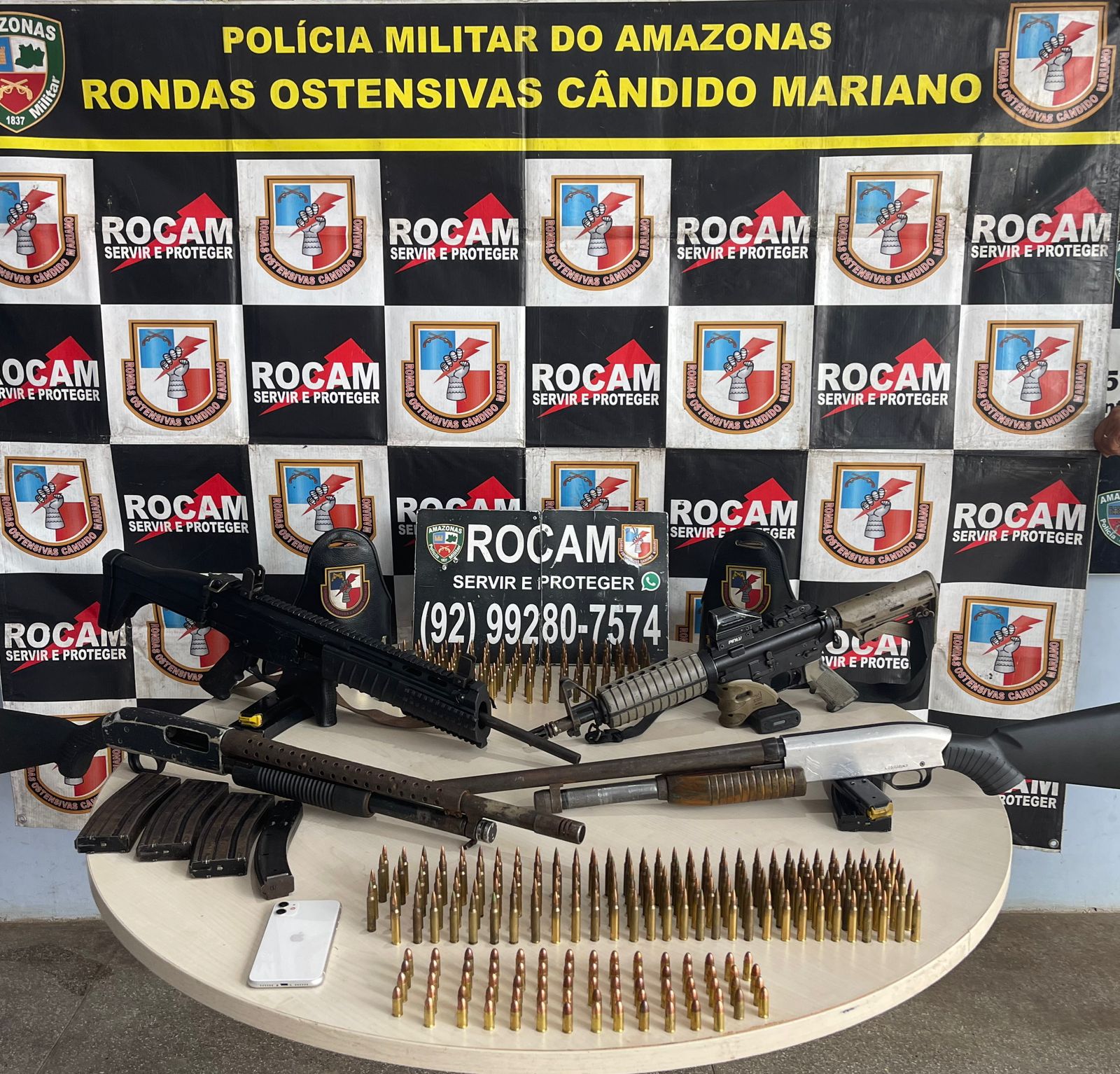 A Polícia Militar do Amazonas (PMAM), por meio das Rondas Ostensivas Cândido Mariano (Rocam), prendeu, na madrugada deste sábado (31/05), uma mulher de 24 anos. A prisão foi efetuada no porto de Fonte Boa (a 678 quilômetros de Manaus), após a suspeita ser flagrada transportando quatro armas de fogo de grosso calibre, dentre elas um fuzil calibre 556 e mais de 300 munições.