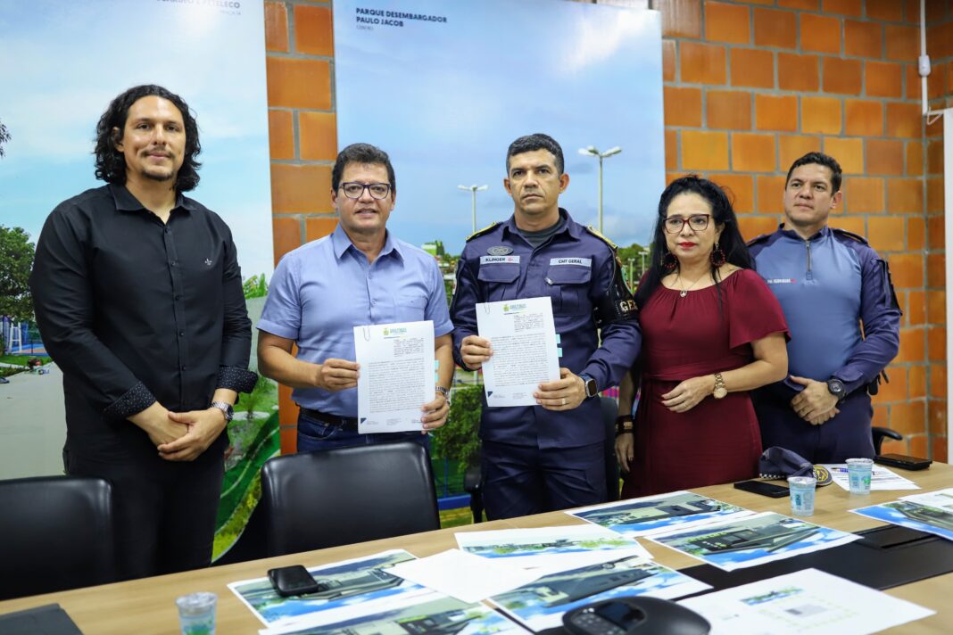 A assinatura do Acordo de Cooperação Técnica contou com a participação do secretário da Sedurb e da UGPE, Marcellus Campêlo, do comandante geral da PMAM, coronel Klinger Paiva, e do comandante da 30ª Companhia Interativa Comunitária (Cicom), major Aldivan Rodrigues.
