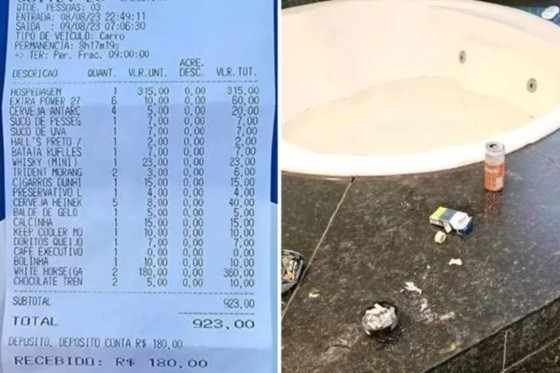 Depois de oito horas de uma “festinha privê” em um motel, um casal de homens conseguiu torrar R$ 1 mil com os mais variados itens, entre bebidas alcoólicas, salgados, camisinhas e até uma calcinha. Em seguida, a dupla animada tentou dar um “migué” nos donos do estabelecimento e fugir sem pagar. A confusão ocorreu entre a noite de terça (8/8) e a manhã de quarta-feira (9/8), em Anápolis (GO).