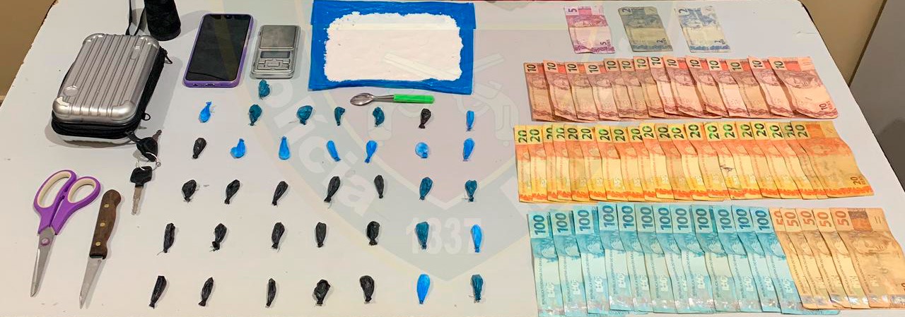 Com base nas informações, os policiais foram ao local indicado, onde abordaram o suspeito e apreenderam R$ 190. À polícia, ele confirmou a comercialização e apontou o local da fabricação da droga. No local, foram encontradas 36 trouxinhas de cocaína, uma porção de cocaína, uma balança de precisão, R$ 1.809 em espécie, além de materiais utilizados para embalar o entorpecente.