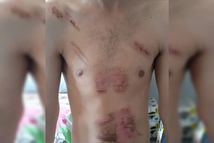 - O homem estava com queimaduras de ferro de passar aquecido e chapinha de cabelo, socos, amarração dos pulsos e calcanhares, sinais de amordaçamento.
