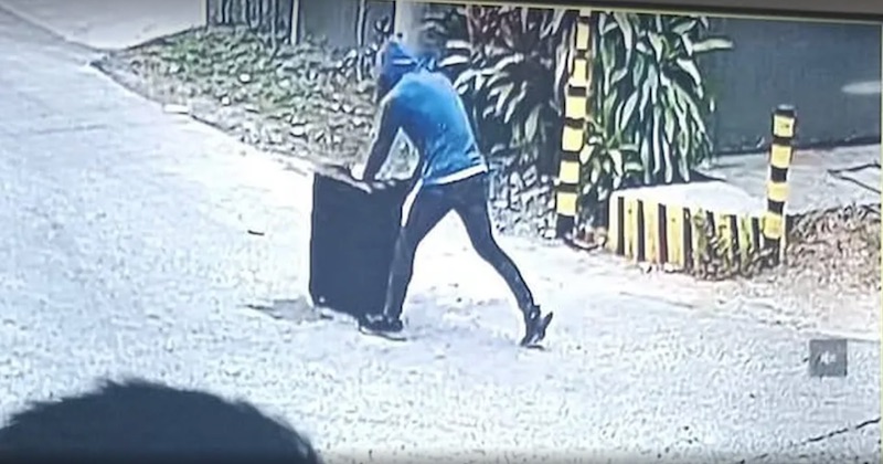 As imagens, também divulgadas pelo Daily Mail, mostram uma pessoa utilizando um capuz dentro do quintal. Em seguida, esse mesmo indivíduo aparece carregando uma mala preta de grande porte.