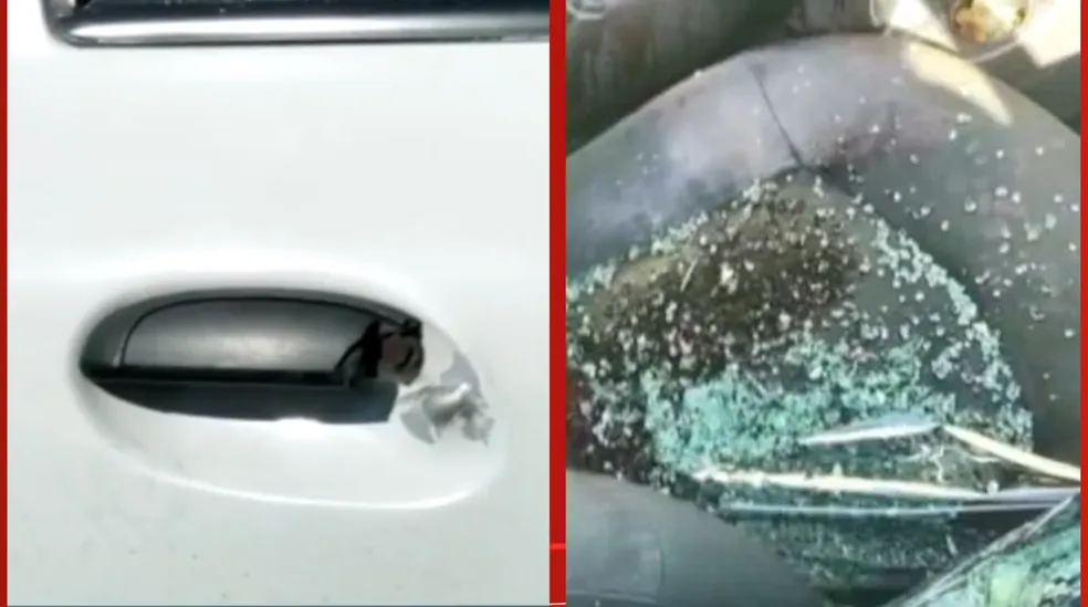 Os assaltantes então dispararam diversas vezes. Foram constadas marcas de tiro na porta do veículo e também no vidro da frente ao lado do banco carona direito.