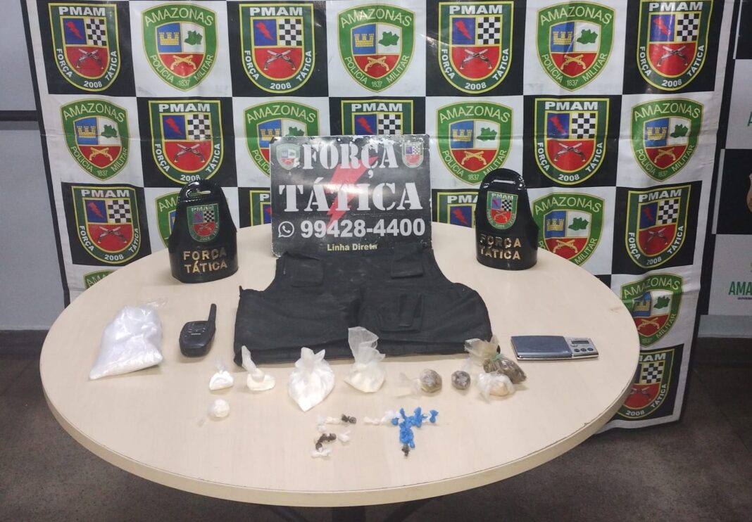 A Polícia Militar do Amazonas (PMAM), por meio da Força Tática, prendeu um homem, de 29 anos, por tráfico de drogas, na noite de quarta-feira (15/11). A ação ocorreu no bairro Parque 10 de Novembro, zona centro-sul de Manaus, e resultou na apreensão de porções de entorpecentes, colete balístico, balança de precisão e rádio comunicador