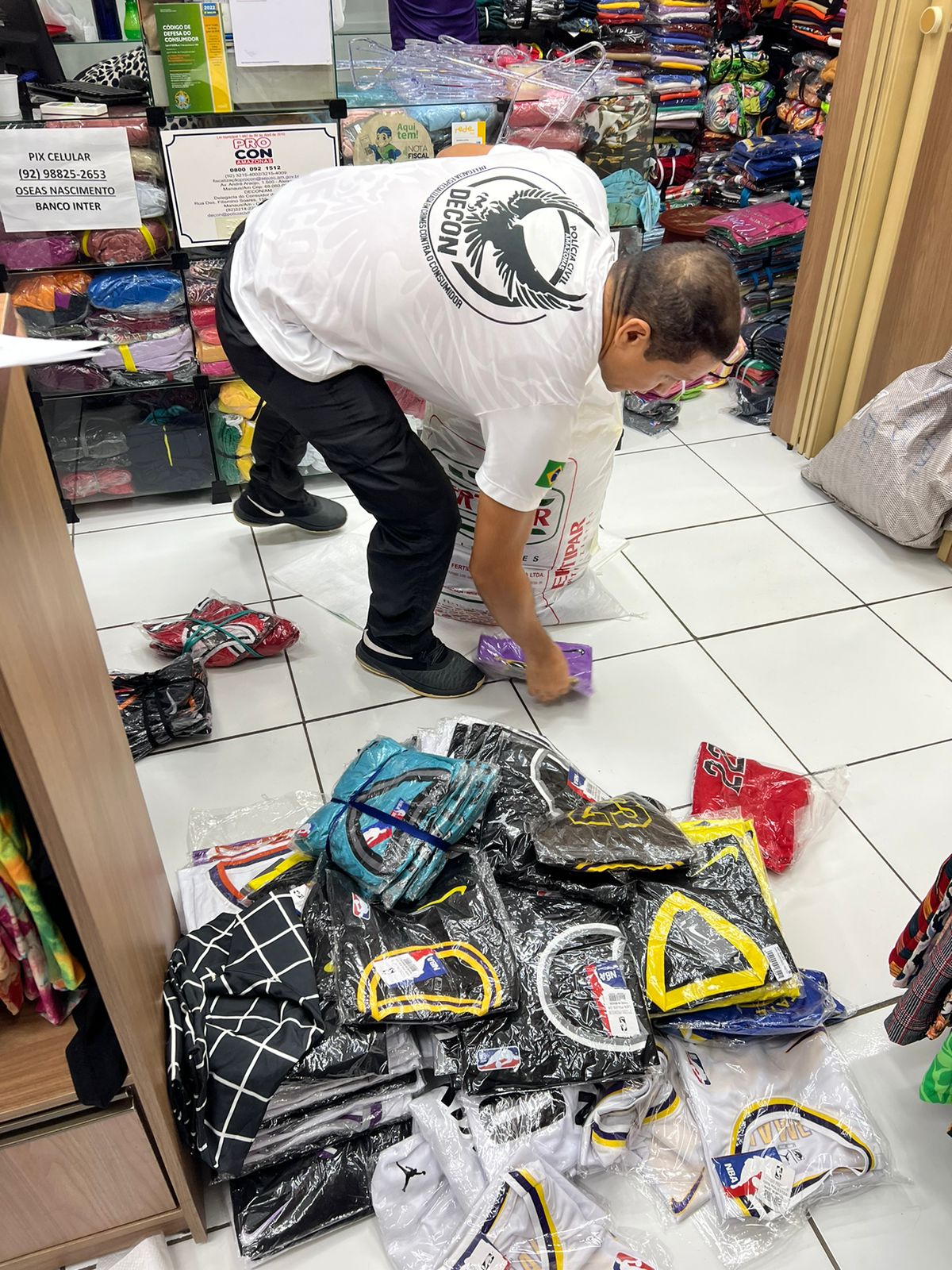 “Nós recebemos denúncias sobre o crime. Com base nisso, realizamos esta ação na manhã de hoje juntamente com o Procon Manaus. Durante buscas em cinco lojas, conseguimos apreender uma vasta quantidade de produtos contrafeitos das marcas que apresentaram representação criminal, como Major League Baseball Properties, NBA Properties INC., Hugo Boss e Umbro International Limited”, explicou Guevara.