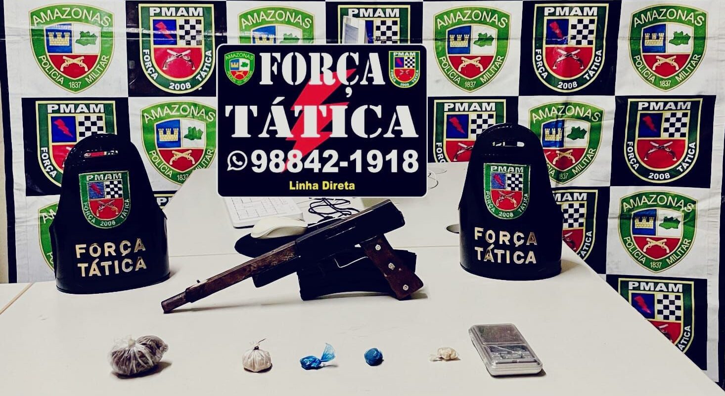 Porções de entorpecentes, uma arma caseira e uma balança de precisão foram apreendidas com um adolescente, de 15 anos, durante a Operação Fronteira Mais Segura, da Secretaria de Segurança Pública (SSP-AM), deflagrada no município de Iranduba (a 27 quilômetros de Manaus). A ação aconteceu na noite de terça-feira (28/05) e gerou danos em mais de R$1 mil ao crime.