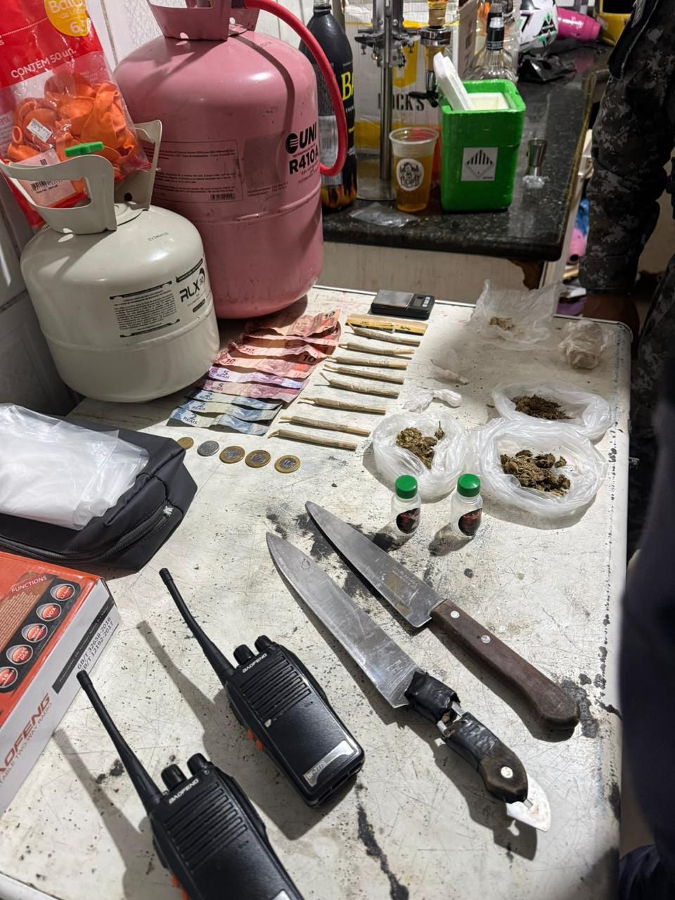 Um homem foi preso por tráfico de drogas, com ele foram encontradas porções de entorpecentes e outros materiais ilícitos. Duas pessoas ainda foram conduzidas para averiguação, incluindo descumprimento de medidas judiciais.