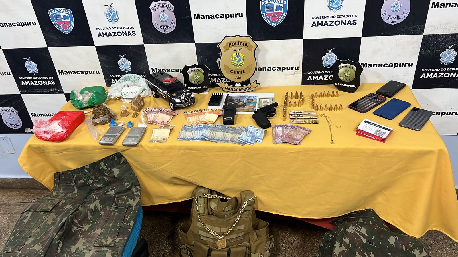 “Durante buscas na residência do indivíduo, apreendemos porções grandes de diversos entorpecentes, como maconha, pedra e cocaína, além de armas de fogo, munições, rádio transmissor, balança de precisão, colete a prova de balas, bem como uma roupa rajada semelhante à de militar”, falou.