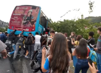 Um ônibus ficou pendurado em uma ribanceira na tarde desta sexta-feira (11) em Conselheiro Paulino, na cidade de Nova Friburgo, na Região Serrana do Rio....