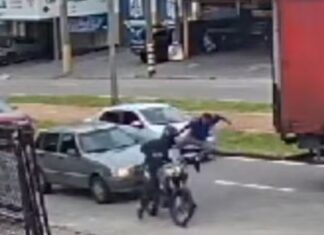 Suspeito com moto roubada leva uma voadora no peito antes de cometer assalto, veja...