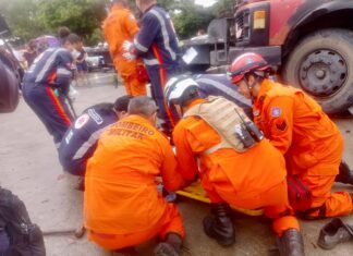 Com trabalho técnico minucioso, bombeiros resgatam homem preso embaixo da roda de caçamba