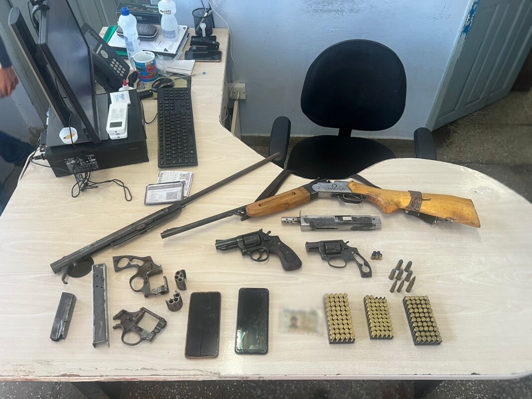 Segundo o delegado, na casa do infrator, foram apreendidas uma espingarda calibre 38 e dois revólveres do mesmo calibre, além de munições de diversos calibres e materiais metalúrgicos, que o indivíduo utilizava para produção e manutenção de armas de fogo.