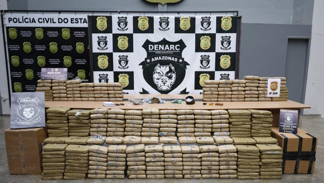 A Polícia Civil do Amazonas (PC-AM), por meio do Departamento de Investigação sobre Narcóticos (Denarc), com apoio do 9º Distrito Integrado de Polícia (DIP), prendeu em flagrante, na segunda-feira (06/04), um homem, de 28 anos, e uma mulher, de 20 anos, em posse de 300 quilos de maconha do tipo skunk, avaliados em R$ 6 milhões. A prisão ocorreu na residência do casal, situada no conjunto Parque das Nações, bairro Flores, zona centro-sul de Manaus.