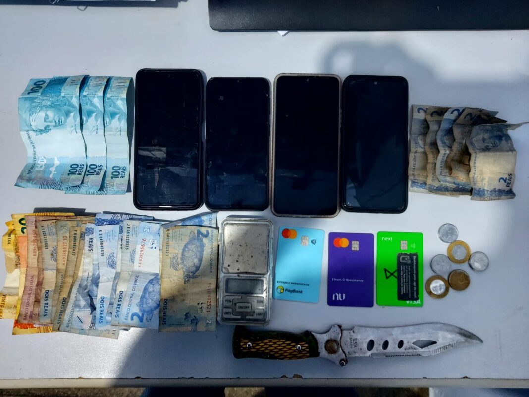 Conforme a delegada, durante o cumprimento dos mandados, foram apreendidas pasta base de cocaína, porções de maconha, aparelhos celulares, balança de precisão, facas, 500 reais em espécie e entre outros objetos.