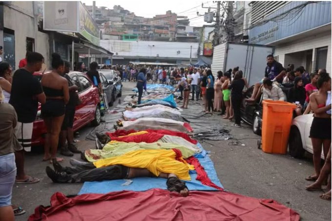 Moradores do Complexo da Penha, na Zona Norte do Rio de Janeiro, levaram pelo menos 50 corpos para a Praça São Lucas, na Estrada José Rucas, uma das principais da região, ao longo da madrugada desta quarta-feira (29), o dia seguinte à operação mais letal da história do RJ.