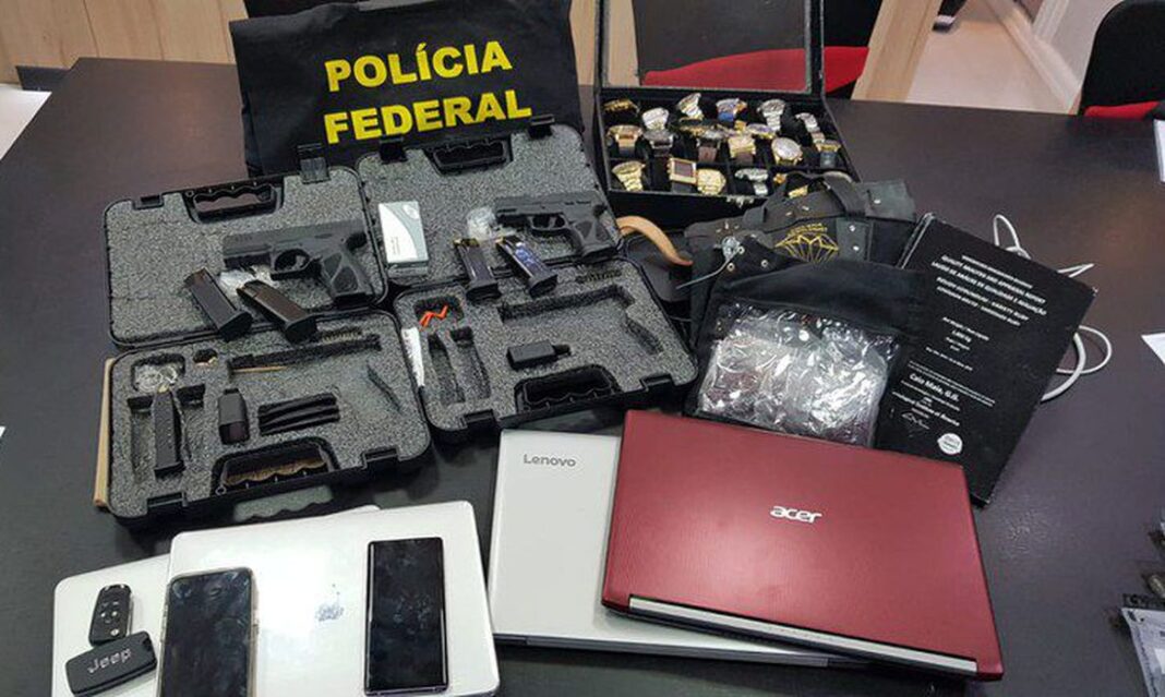 Na ação, foram apreendidos veículos, documentos, joias, telefones celulares, relógios e recolhidos os passaportes dos dois principais investigados. Uma pessoa foi presa em flagrante por posse ilegal de arma de fogo.