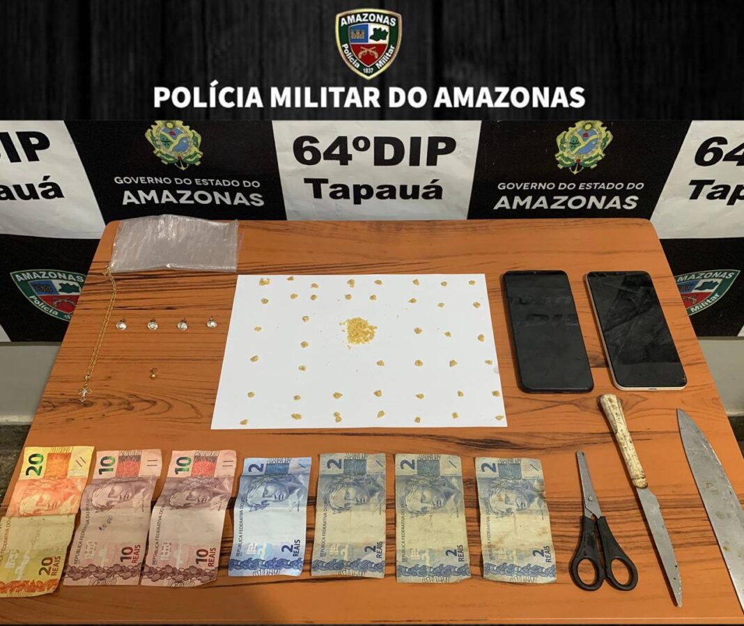 Na abordagem pessoal, nada ilícito foi encontrado, mas na busca no local, policiais encontraram 48 porções de pedra oxi, duas armas brancas (faca), uma tesoura e R$ 48 em espécie.