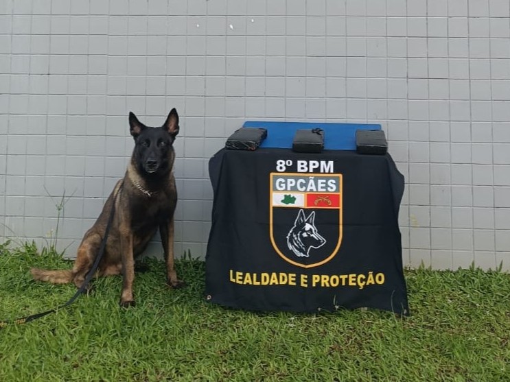 Durante a revista, o cão policial Hulk sinalizou a presença de possível material ilícito dentro de uma bolsa. Após as buscas, os policiais militares encontraram cerca quatro tabletes de pasta-base de cocaína.