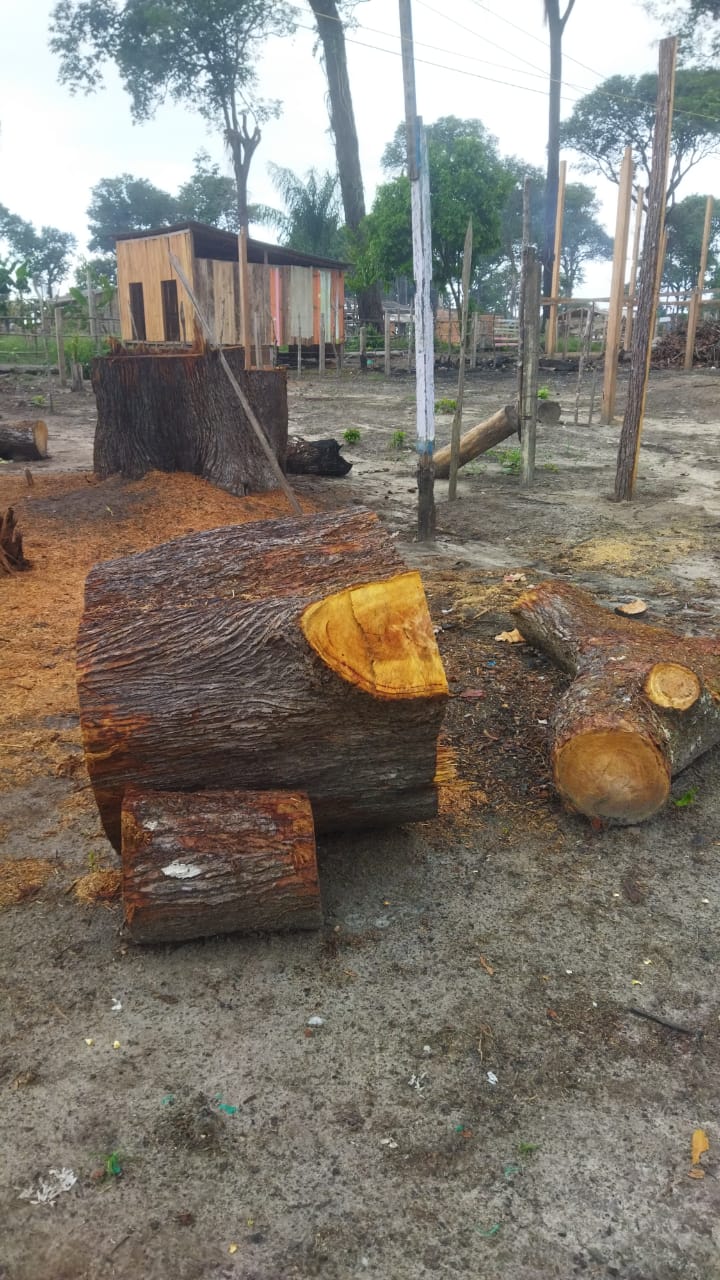 Segundo os policiais militares que atenderam a ocorrência, a ação se deu após denúncia via linha direta do 11º BPM. A equipe policial, ao chegar no local, constatou a derrubada de árvores, tipo castanheira, o que caracteriza crime ambiental.