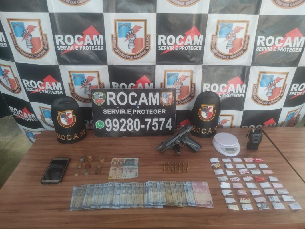 No segundo local, os policiais da Rocam encontraram uma arma de fogo, munições e um rádio comunicador. No total, nas duas residências, foram encontrados uma arma de fogo, tipo pistola calibre 380, 15 munições do mesmo calibre, 40 porções de pasta base de cocaína, uma balança de precisão, um rádio comunicador, um aparelho celular, R$ 77,60 em espécie e 16.920 em pesos colombianos.