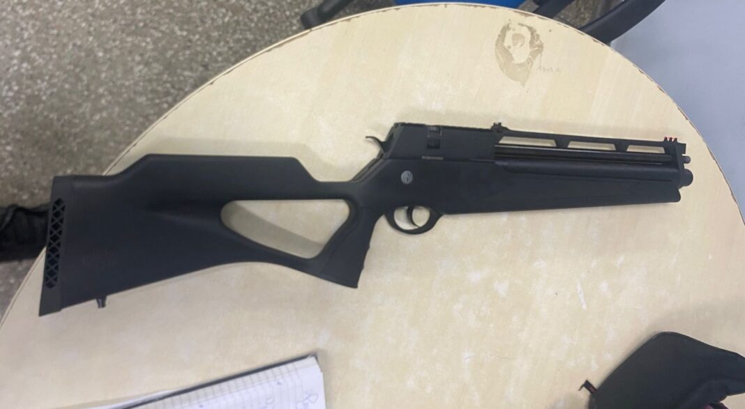 Diante da gravidade da situação, a equipe da 29ª Cicom realizou a abordagem do veículo, um Renault Sandero cinza, de placas OAB-8696. Durante a revista, os policiais militares encontraram com o suspeito uma carabina Rossi preta, calibre 5,5 mm, com capacidade para oito disparos e carregada com seis munições. As vítimas foram retiradas em segurança do veículo.