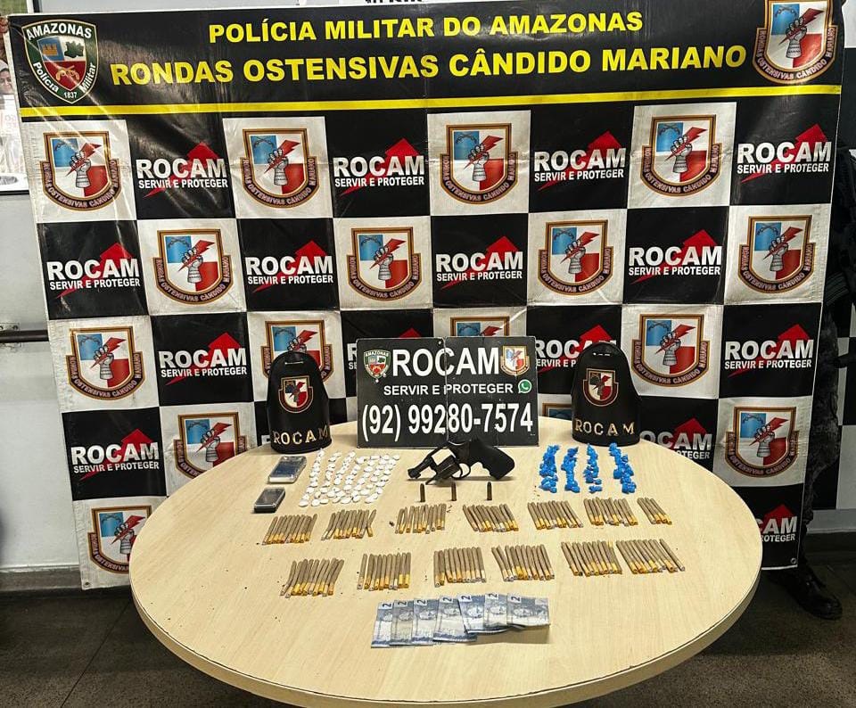 A Polícia Militar do Amazonas (PMAM), por meio das Rondas Ostensivas Cândido Mariano (Rocam), prendeu um homem, de 38 anos, na tarde de segunda-feira (14/10), e apreendeu entorpecentes e arma de fogo, no bairro Colônia Oliveira Machado, zona sul de Manaus.