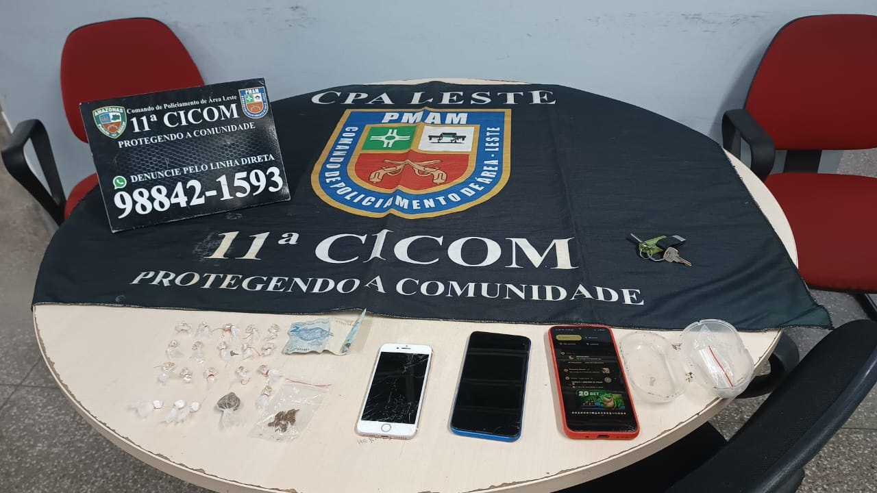 Os policiais militares da 11ª Companhia Interativa Comunitária (Cicom) prenderam um homem, 39, por tráfico de drogas, na rua Vitória, bairro Coroado I, zona leste. Com ele, a equipe policial apreendeu 16 trouxinhas de oxi, três trouxinhas de cocaína, três trouxinhas de maconha e quatro aparelhos celulares.