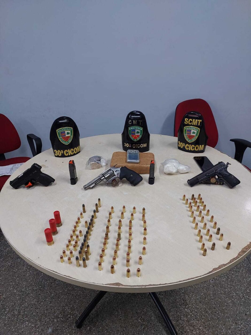 Durante a ação, foi apreendido com eles três armas de fogo, sendo uma pistola calibre 40, com três carregadores; uma pistola Imbel calibre 9 milímetros, com um carregador; um revólver calibre 38. Também foi encontrado um tablete de aproximadamente 1 quilo de maconha; 38 munições calibre 40 intactas; 32 munições calibre 9 milímetros intactas; cinco cartuchos calibre 12 intactos; 15 munições de calibre 38 intactas; três munições, calibre 357; três porções de cocaína e três porções de oxi, além da chave do carro de uma das vítimas do roubo, ocorrido momento antes na rua menino Jesus, no bairro Monte Sião.