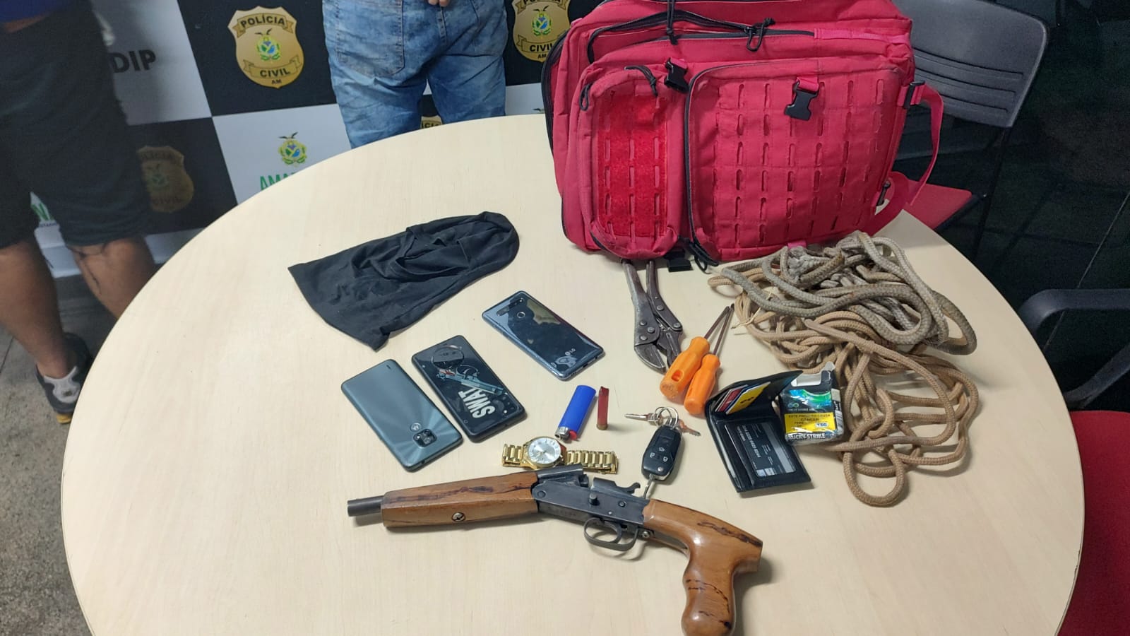 Após revista pessoal, foi constatado que a placa do carro era clonada, além disso, foram encontrados três aparelhos celulares e uma arma de fogo com munição deflagrada. Os suspeitos foram encaminhados ao Serviço de Pronto Atendimento (SPA) da zona sul para atendimentos de primeiros socorros e em seguida conduzidos ao 1º Distrito Integrado de Polícia (DIP).