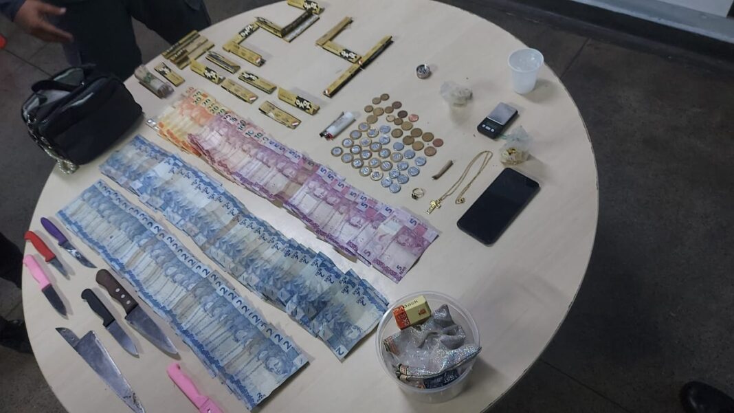 Com a dupla foram encontrados dois cigarros de maconha, duas trouxinhas de oxi, mais de R$ 480 em espécie, sete facas, pacotes para embalar drogas, um enrolador de maconha, 28 gramas de pedra de oxi escondidas no sutiã da mulher, 20 gramas de entorpecente em uma gaveta trancada, balança de precisão, celular, cordão e moedor de pedra. O casal foi levado ao 1º Distrito Integrado de Polícia (DIP).