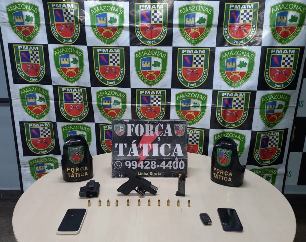 Em outra ação de patrulhamento de rotina, desta vez no bairro Educandos, policiais militares da Força Tática prenderam dois homens com uma pistola calibre 9 milímetros. Ainda na ação, um carregador com 11 munições do mesmo calibre e um carro foram apreendidos.