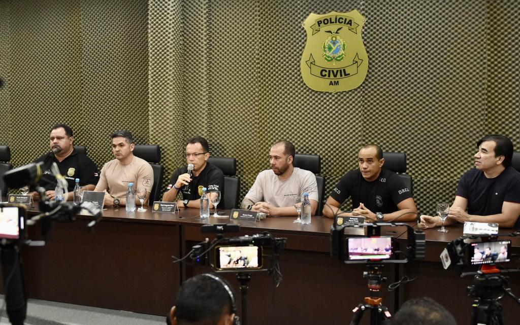 Durante coletiva de imprensa na sede da Delegacia Geral (DG), estiveram presentes o delegado-geral da PC-AM, Bruno Fraga; e os delegados Raul Augusto Neto, titular da 31ª DIP de Iranduba; George Gomes, titular do 7° DIP; Mário Paulo Teles, diretor do DRCO; Juan Valério, coordenador da Core-AM; e Paulo Mavignier, diretor do DPI.