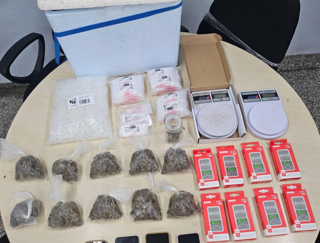 Segundo o delegado, no local foram apreendidas várias porções de drogas, material para armazenamento dos entorpecentes e balanças de precisão.