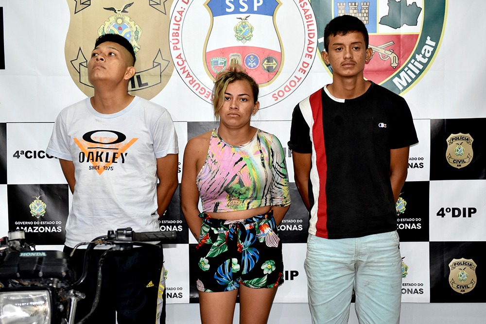 A Polícia Civil do Amazonas, representada pelo delegado Adriano Felix, titular do 4° Distrito Integrado de Polícia (DIP), falou, na tarde desta quinta-feira (02/05), durante coletiva de imprensa realizada às 14h30, no prédio da unidade policial, sobre a prisão em flagrante de Adriano Melo dos Santos, 25, conhecido como “Japoca”, e do casal Railce Vitor de Souza, 22, e Wesley de Araújo, 18. Eles foram denunciados por furtos de motocicletas na capital.