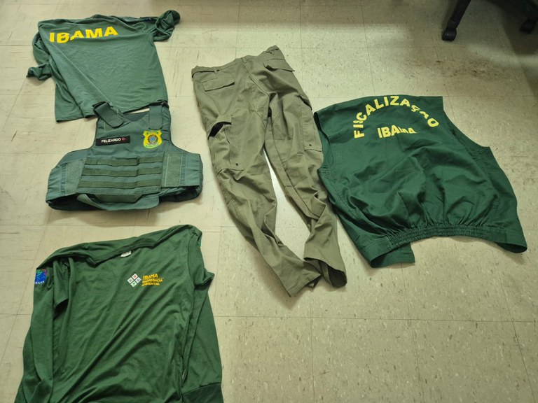 Durante as diligências foram apreendidos na residência do investigado, vários objetos com a identificação do IBAMA, inclusive um colete balístico no qual foi aposta uma tarjeta de identificação com o nome dele, o que reforça a suspeita de que ele se fazia passar por Agente de Fiscalização do IBAMA. Também foi apreendida uma pistola de Air Soft sem a marcação de identificação, de modo que as características do objeto se assemelham a simulacro de arma de fogo.