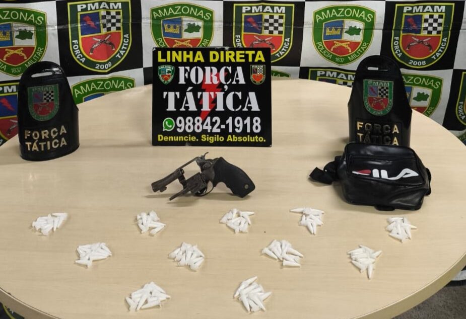 A Polícia Militar do Amazonas (PMAM), por meio da Força Tática, apreendeu uma arma de fogo e mais de 100 pinos de droga, na madrugada desta quarta-feira (26/02), no bairro Praça 14 de Janeiro, zona sul de Manaus.