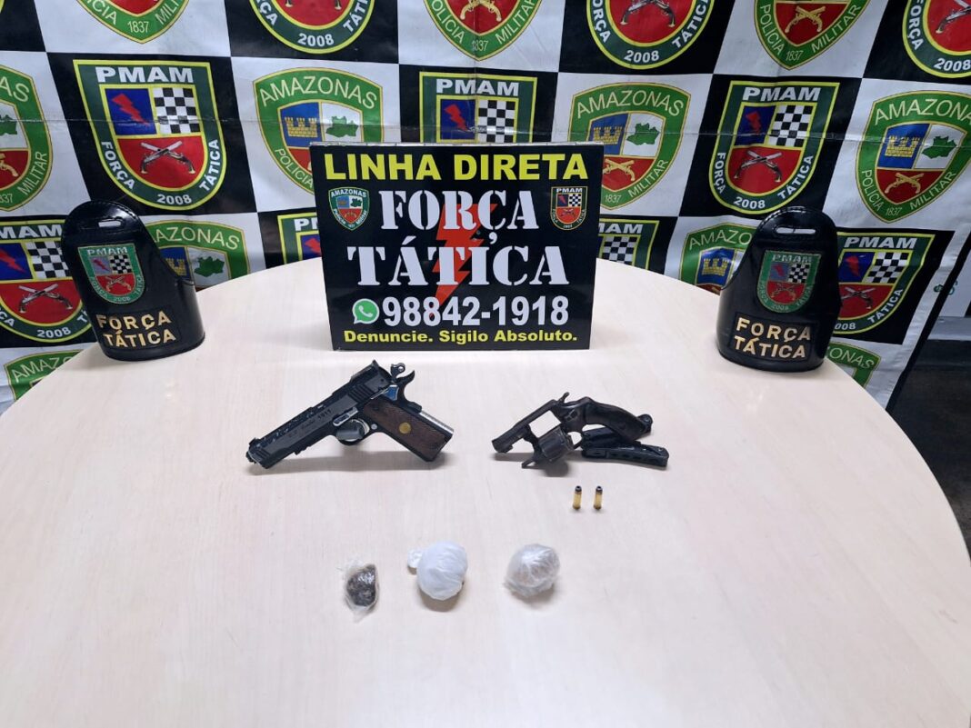 A Polícia Militar do Amazonas (PMAM), por meio da Força Tática, apreendeu uma arma de fogo, um simulacro e entorpecentes, no domingo (30/06), durante incursão em área da avenida Visconde de Porto Alegre, Praça 14, zona sul de Manaus.