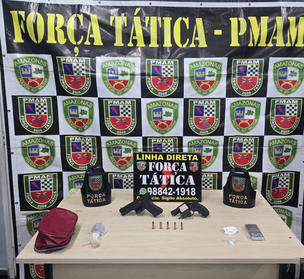 A Polícia Militar do Amazonas (PMAM), por meio da Força Tática, apreendeu armas e drogas, na segunda-feira (14/10), no bairro Cidade Nova, zona norte da capital. A ação foi realizada após incursão em uma área de movimentação de tráfico de drogas.
