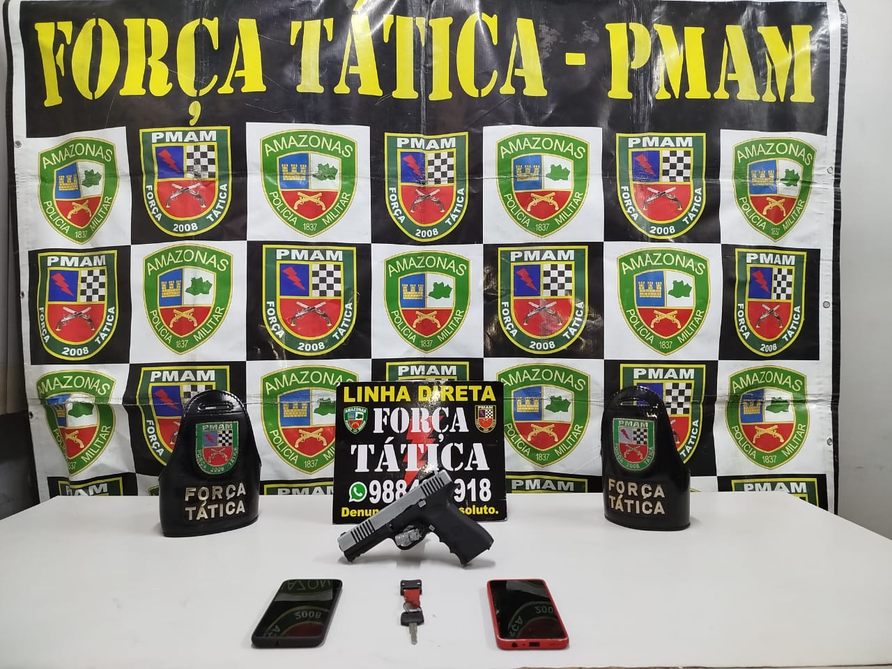 A Polícia Militar do Amazonas (PMAM), por meio da Força Tática, apreendeu dois adolescentes, de 15 e 17 anos, suspeitos de estarem envolvidos em roubo praticado na noite de terça-feira (08/04), no bairro Nova Cidade, zona norte de Manaus. Na ação, dois aparelhos celulares, um simulacro de arma de fogo e uma motocicleta foram apreendidos.