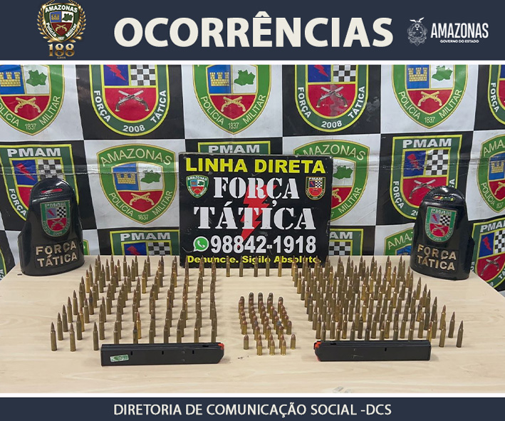 A Polícia Militar do Amazonas, por meio da Força Tática, apreendeu, na tarde de quinta-feira (15/09), 269 munições para armamento de grosso calibre, que estavam em um apartamento, localizado na rua Pena Verde, no Conjunto Viver Melhor 3, bairro Monte das Oliveiras, zona norte de Manaus.