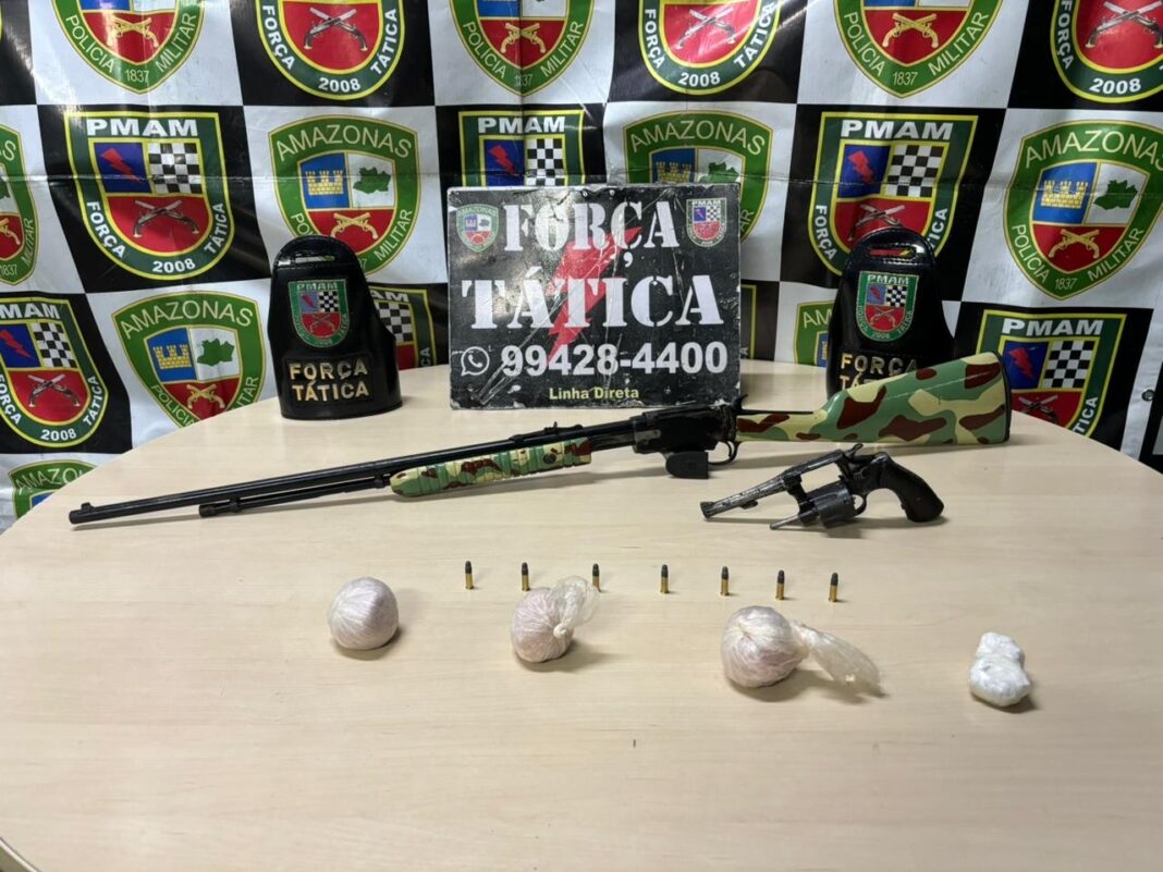 A Polícia Militar do Amazonas (PMAM), por meio da Força Tática, apreendeu duas armas de fogo, sendo um rifle de calibre 22 e um revólver calibre 32, na noite de terça-feira (12/12), no bairro Educandos, zona sul de Manaus. Na ação, também foram apreendidas porções de entorpecentes e munições.