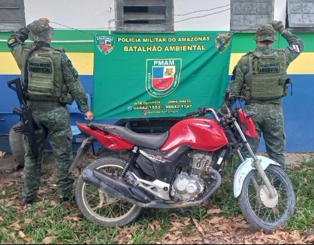 Em patrulhamento, o BPAmb, juntamente com a equipe de fiscais do Instituto de Proteção Ambiental do Amazonas (IPAAM), apreendeu em um ramal, uma motocicleta de cor vermelha com restrição de roubo que foi abandonada em um ramal no município de Rio Preto da Eva.