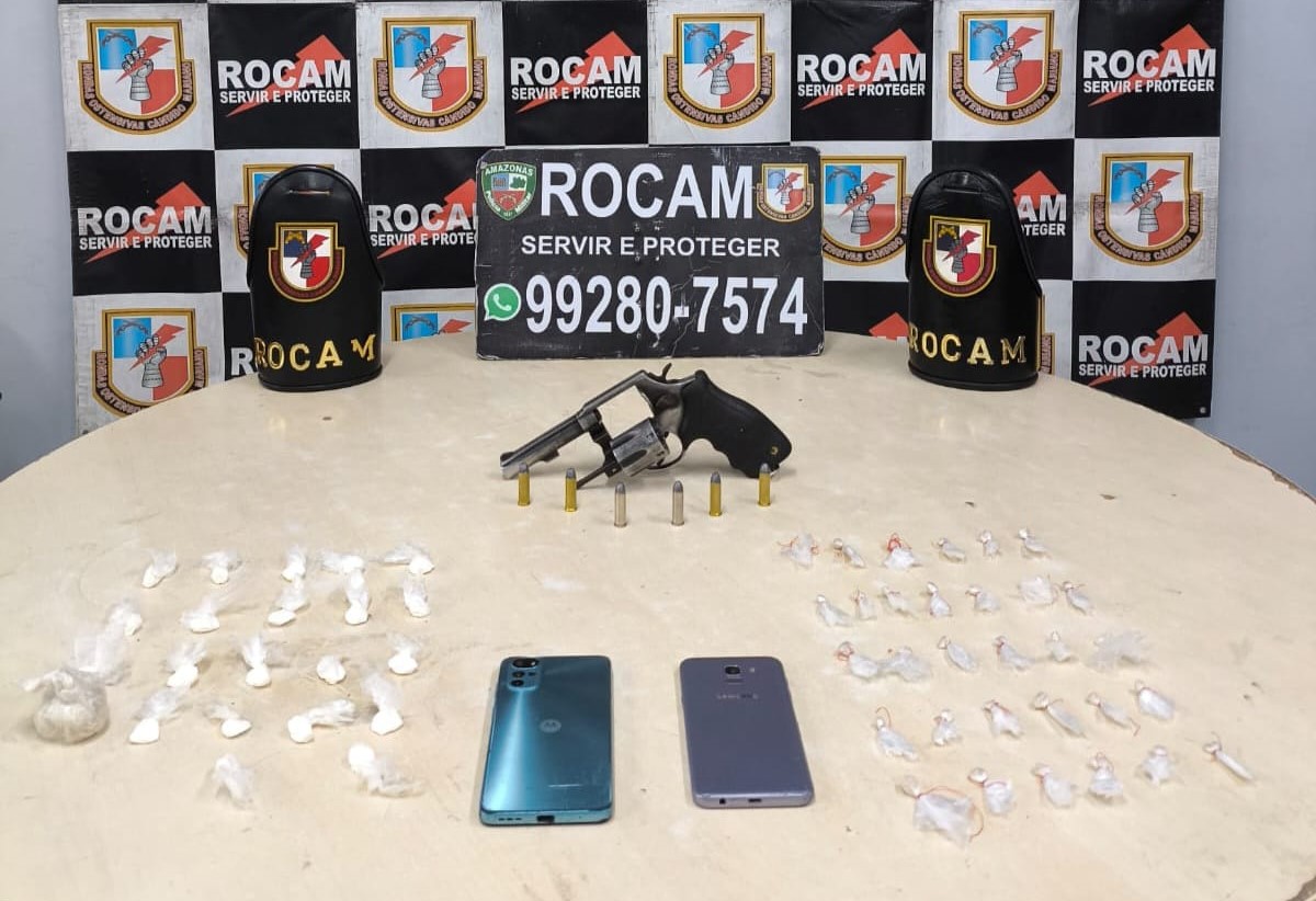 Ao realizarem a revista pessoal, foram encontradas 21 porções de cocaína, 32 porções de oxi, dois celulares, um revólver calibre 38 e seis munições do mesmo calibre.